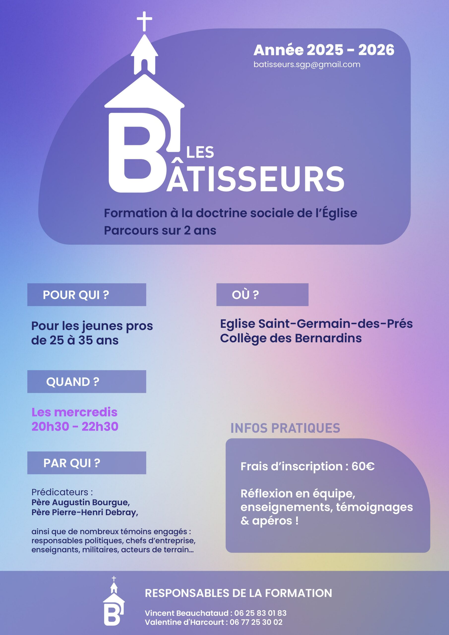 Formation à la Doctrine Sociale de l’Eglise sur deux ans pour les étudiants en fin de cycle et jeunes pros qui veulent aller plus loin dans leur connaissance de l’Eglise. Un programme sur deux ans, basé sur les rencontres d’acteurs de la vie politique, économique et sociale française.